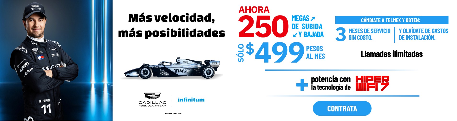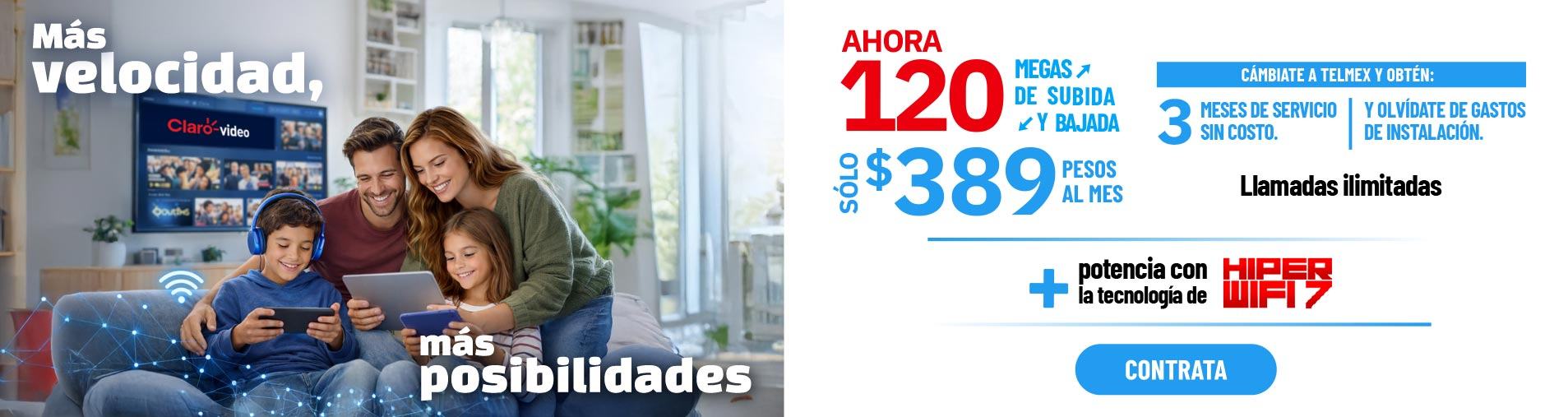 Precios con impuestos incluidos. Las velocidades comunicadas son en Megas (Megabits por segundo) y corresponden a la velocidad máxima de transferencia de datos ofrecida y alcanzable, la velocidad de bajada y subida podrá variar en función de las condiciones técnicas del módem, cantidad de dispositivos conectados simultáneamente y/o la distancia entre el domicilio del usuario y la central. A partir del 7o mes el cliente continuará con la velocidad de su paquete originalmente contratado. La velocidad aplica para usuarios nuevos que cuentan con fibra óptica instalada. Promoción de 100% de descuento en la renta de los meses 4, 8 y 12 (sobre servicio de telecomunicaciones) y promoción de descuento del 100% en gastos de instalación ($1,600 con impuestos), aplican para clientes que realizan el cambio de su servicio de telecomunicaciones a Telmex. Hiper Wifi 7 no está incluido. La oferta anunciada corresponde a la adquisición de 2 equipos Mesh “HIPER WiFi 7” (incluye 2 equipos Mesh, 2 cables de red Ethernet y 2 adaptadores de corriente). Promoción aplicable a usuarios nuevos y existentes. CAT mensual del 4.7%. Consulta disponibilidad y compra en Centros de Atención Telmex y en telmex.com/tiendaenlinea Clientes No Infinitum, pueden verificar disponibilidad y precios en esta misma página. Los equipos serán entregados en el domicilio de tu Recibo Telmex. Plazos, condiciones, inscripciones IFT (ahora CRT) y velocidades promedio de descarga aplicables en telmex.com/terminoshogar Vigencia al 31 de mayo de 2026.