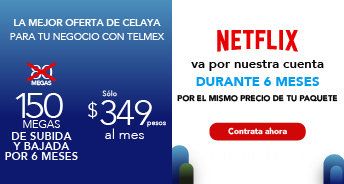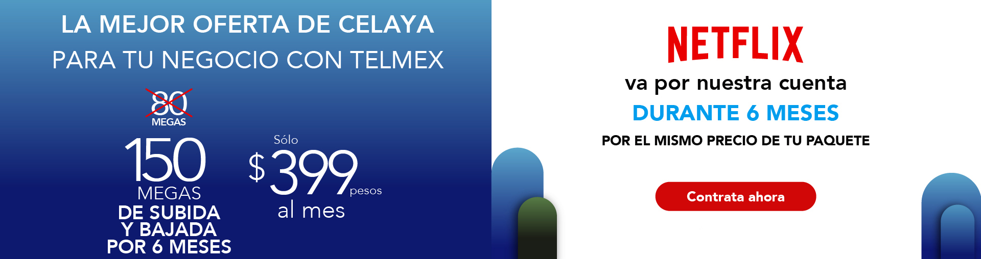 La oferta anunciada corresponde a la contratación del Paquete Conectes Negocio + Netflix Estándar con anuncios. Precios con impuestos incluidos. Las velocidades comunicadas son en Megas (Megabits por segundo), y corresponden a la velocidad máxima de transferencia de datos ofrecida y alcanzable, la velocidad de bajada y subida podrá variar en función de las condiciones técnicas del módem, cantidad de dispositivos conectados simultáneamente y/o la distancia entre el domicilio del usuario y la central. A partir del 7o mes el cliente continuará con la velocidad de su paquete originalmente contratado Paquete Conectes Negocio (80 Megas). Netflix todos los derechos reservados. Precios válidos para contrataciones realizadas a partir del 8 de octubre de 2024, a partir del 7° mes se pagará la renta de Netflix. Netflix, Claro Drive y las Soluciones Negocio son  servicios proporcionados por terceros.  Consulta plazos, beneficios, promociones, condiciones, inscripciones IFT (ahora CRT) y velocidades promedio de descarga aplicables en telmex.com/terminosnegocio