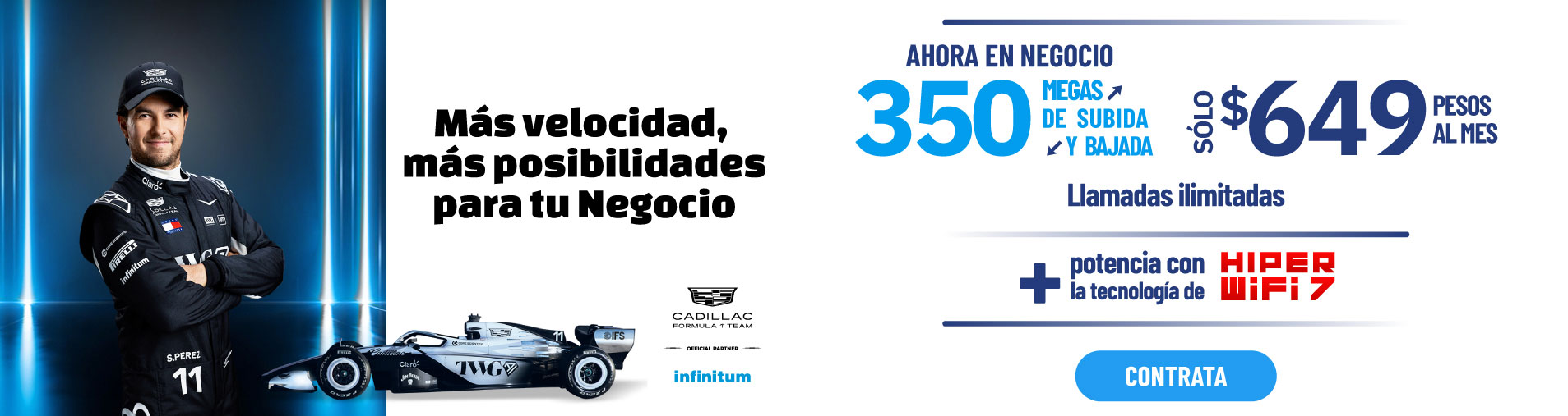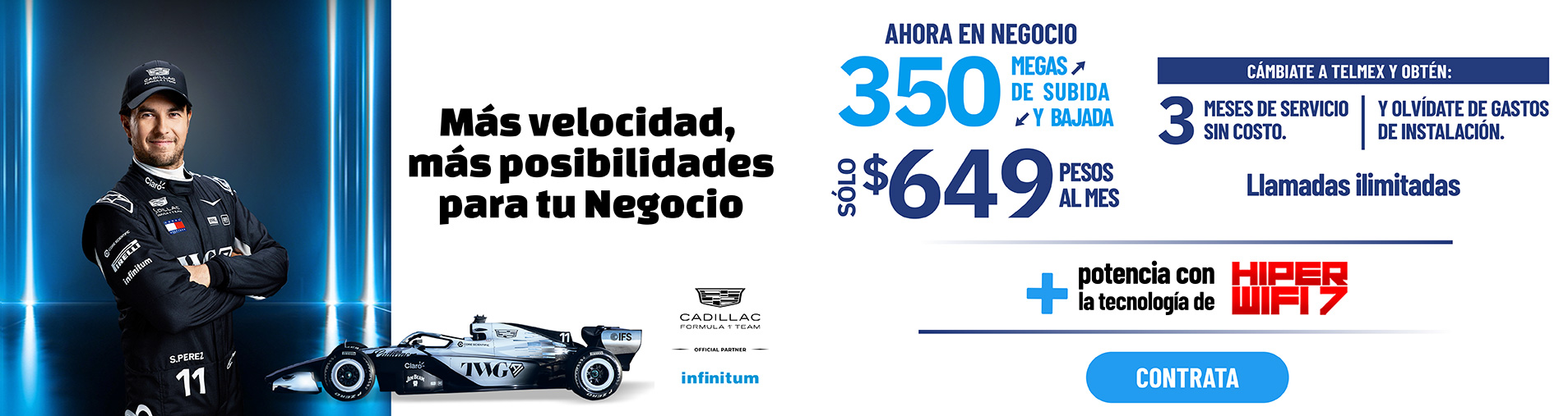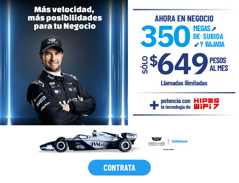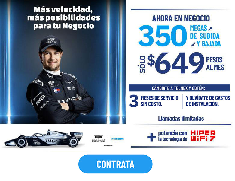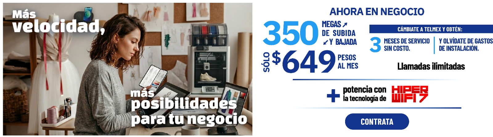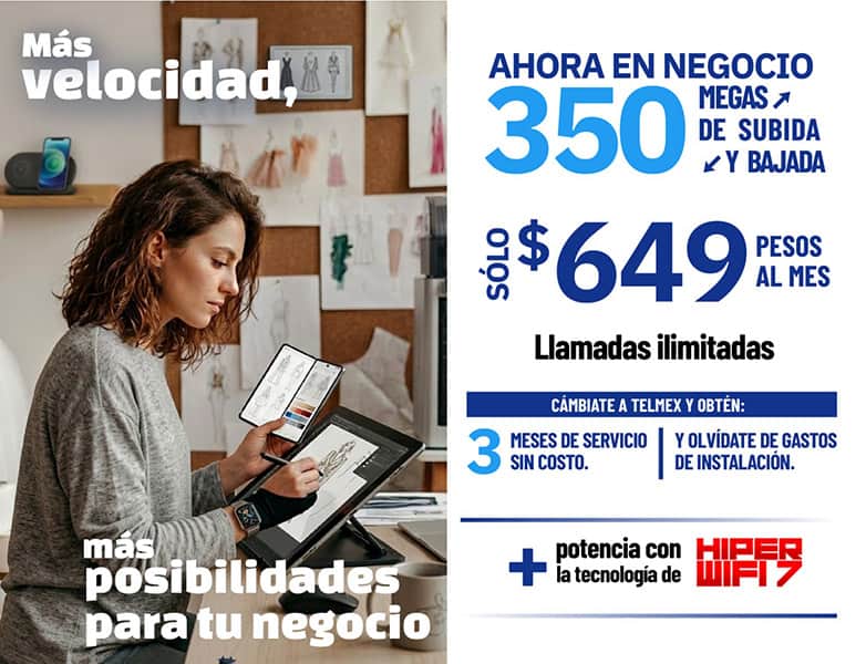 Precios con impuestos incluidos. La renta incluye llamadas ilimitadas a números fijos y móviles en México, Estados Unidos, Canadá y hasta 180 países más, consulta lista de destinos completa en telmex.com/destinosLDI Las velocidades comunicadas son en Megas (Megabits por segundo) y corresponden a la velocidad máxima de transferencia de datos ofrecida y alcanzable, la velocidad de bajada y subida podrá variar en función de las condiciones técnicas del módem, cantidad de dispositivos conectados simultáneamente y/o la distancia entre el domicilio del usuario y la central. A partir del 7o mes el cliente continuará con la velocidad de su paquete originalmente contratado. La velocidad aplica para usuarios activos sin adeudos en sus servicios de telecomunicaciones y nuevos que cuentan con fibra óptica instalada.Promoción de 100% de descuento en la renta de los meses 4, 8 y 12 (sobre servicio de telecomunicaciones) y promoción de descuento del 100% en gastos de instalación ($1,600 con impuestos), aplican para clientes que realizan el cambio de su servicio de telecomunicaciones a Telmex. Hiper Wifi 7 no está incluido. La oferta corresponde a un precio de contado de $2,799 o 12 mensualidades fijas de $239 por la adquisición de 2 equipos Mesh “HIPER WiFi 7” (incluye 2 equipos Mesh, 2 cables de red Ethernet y 2 adaptadores de corriente). Promoción aplicable a usuarios nuevos y existentes. CAT mensual del 4.7%. Consulta disponibilidad y compra en Centros de Atención Telmex y en telmex.com/tiendaenlinea Clientes No Infinitum, pueden verificar disponibilidad y precios en esta misma página. Los equipos serán entregados en el domicilio de tu Recibo Telmex. Plazos, condiciones, inscripciones IFT (ahora CRT) y velocidades promedio de descarga aplicables en telmex.com/terminosnegocio Vigencia al 30 de abril de 2026.